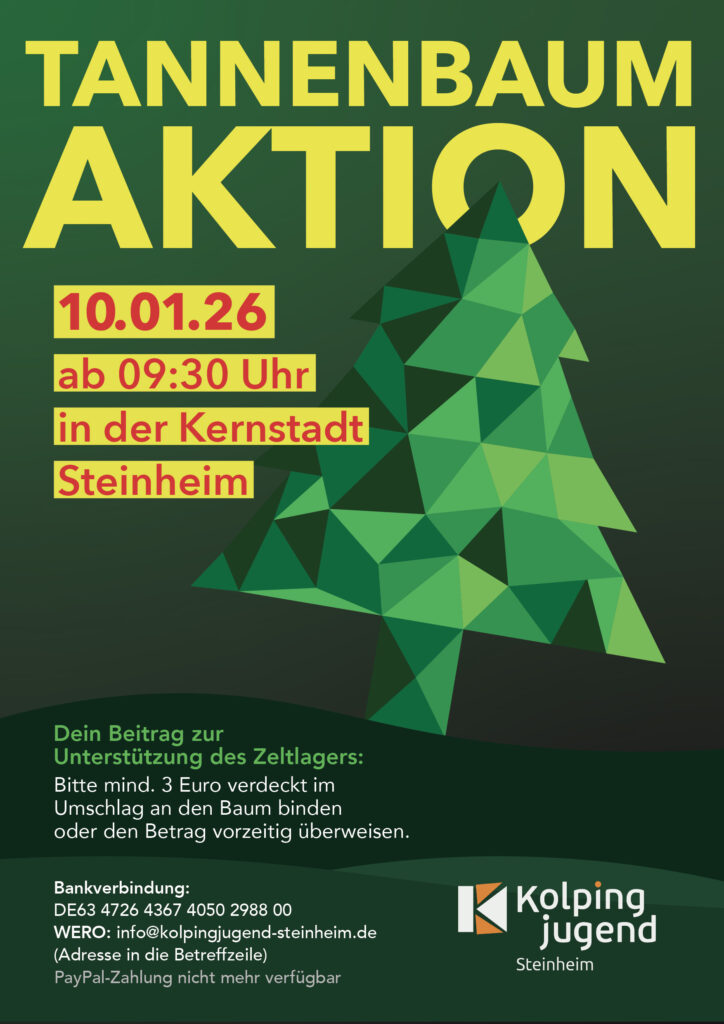 Die Kolpingjugend Steinheim sammelt am Samstag, den 10. Januar 2026, die ausgedienten Weihnachtsbäume in der Kernstadt Steinheim ein. Die Abholung beginnt ab 09:30 Uhr und erfolgt ehrenamtlich durch Mitglieder unseres Vereins.